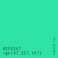 Цвет #2FE3A7 в цветовой модели RGB обозначается тремя октетами (47, 227, 167) в десятичном формате и #2FE3A7 в шестнадцатиричном (hex) формате, которые являются интенсивностью красного 47 (hex 2F), интенсивность зелёного 227 (hex E3) и интенсивность синего 167 (hex A7).