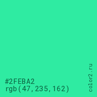 Цвет #2FEBA2 в цветовой модели RGB обозначается тремя октетами (47, 235, 162) в десятичном формате и #2FEBA2 в шестнадцатиричном (hex) формате, которые являются интенсивностью красного 47 (hex 2F), интенсивность зелёного 235 (hex EB) и интенсивность синего 162 (hex A2).