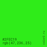 Цвет #2FEC19 в цветовой модели RGB обозначается тремя октетами (47, 236, 25) в десятичном формате и #2FEC19 в шестнадцатиричном (hex) формате, которые являются интенсивностью красного 47 (hex 2F), интенсивность зелёного 236 (hex EC) и интенсивность синего 25 (hex 19).