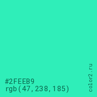 Цвет #2FEEB9 в цветовой модели RGB обозначается тремя октетами (47, 238, 185) в десятичном формате и #2FEEB9 в шестнадцатиричном (hex) формате, которые являются интенсивностью красного 47 (hex 2F), интенсивность зелёного 238 (hex EE) и интенсивность синего 185 (hex B9).