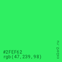 Цвет #2FEF62 в цветовой модели RGB обозначается тремя октетами (47, 239, 98) в десятичном формате и #2FEF62 в шестнадцатиричном (hex) формате, которые являются интенсивностью красного 47 (hex 2F), интенсивность зелёного 239 (hex EF) и интенсивность синего 98 (hex 62).