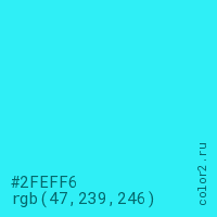 Цвет #2FEFF6 в цветовой модели RGB обозначается тремя октетами (47, 239, 246) в десятичном формате и #2FEFF6 в шестнадцатиричном (hex) формате, которые являются интенсивностью красного 47 (hex 2F), интенсивность зелёного 239 (hex EF) и интенсивность синего 246 (hex F6).