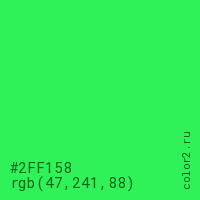 Цвет #2FF158 в цветовой модели RGB обозначается тремя октетами (47, 241, 88) в десятичном формате и #2FF158 в шестнадцатиричном (hex) формате, которые являются интенсивностью красного 47 (hex 2F), интенсивность зелёного 241 (hex F1) и интенсивность синего 88 (hex 58).