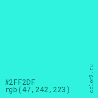 Цвет #2FF2DF в цветовой модели RGB обозначается тремя октетами (47, 242, 223) в десятичном формате и #2FF2DF в шестнадцатиричном (hex) формате, которые являются интенсивностью красного 47 (hex 2F), интенсивность зелёного 242 (hex F2) и интенсивность синего 223 (hex DF).