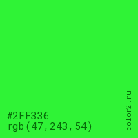 Цвет #2FF336 в цветовой модели RGB обозначается тремя октетами (47, 243, 54) в десятичном формате и #2FF336 в шестнадцатиричном (hex) формате, которые являются интенсивностью красного 47 (hex 2F), интенсивность зелёного 243 (hex F3) и интенсивность синего 54 (hex 36).