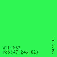 Цвет #2FF652 в цветовой модели RGB обозначается тремя октетами (47, 246, 82) в десятичном формате и #2FF652 в шестнадцатиричном (hex) формате, которые являются интенсивностью красного 47 (hex 2F), интенсивность зелёного 246 (hex F6) и интенсивность синего 82 (hex 52).