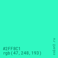 Цвет #2FF8C1 в цветовой модели RGB обозначается тремя октетами (47, 248, 193) в десятичном формате и #2FF8C1 в шестнадцатиричном (hex) формате, которые являются интенсивностью красного 47 (hex 2F), интенсивность зелёного 248 (hex F8) и интенсивность синего 193 (hex C1).