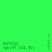 Цвет #2FFC52 в цветовой модели RGB обозначается тремя октетами (47, 252, 82) в десятичном формате и #2FFC52 в шестнадцатиричном (hex) формате, которые являются интенсивностью красного 47 (hex 2F), интенсивность зелёного 252 (hex FC) и интенсивность синего 82 (hex 52).