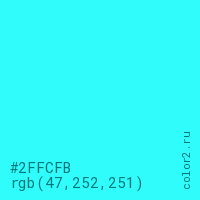 Цвет #2FFCFB в цветовой модели RGB обозначается тремя октетами (47, 252, 251) в десятичном формате и #2FFCFB в шестнадцатиричном (hex) формате, которые являются интенсивностью красного 47 (hex 2F), интенсивность зелёного 252 (hex FC) и интенсивность синего 251 (hex FB).