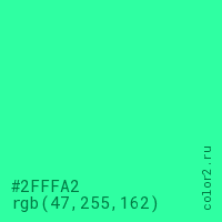 Цвет #2FFFA2 в цветовой модели RGB обозначается тремя октетами (47, 255, 162) в десятичном формате и #2FFFA2 в шестнадцатиричном (hex) формате, которые являются интенсивностью красного 47 (hex 2F), интенсивность зелёного 255 (hex FF) и интенсивность синего 162 (hex A2).
