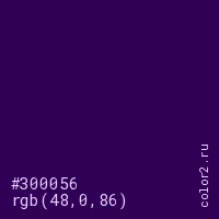 Цвет #300056 в цветовой модели RGB обозначается тремя октетами (48, 0, 86) в десятичном формате и #300056 в шестнадцатиричном (hex) формате, которые являются интенсивностью красного 48 (hex 30), интенсивность зелёного 0 (hex 00) и интенсивность синего 86 (hex 56).