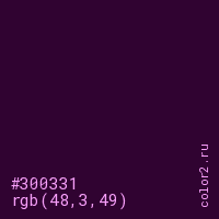 Цвет #300331 в цветовой модели RGB обозначается тремя октетами (48, 3, 49) в десятичном формате и #300331 в шестнадцатиричном (hex) формате, которые являются интенсивностью красного 48 (hex 30), интенсивность зелёного 3 (hex 03) и интенсивность синего 49 (hex 31).