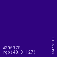 Цвет #30037F в цветовой модели RGB обозначается тремя октетами (48, 3, 127) в десятичном формате и #30037F в шестнадцатиричном (hex) формате, которые являются интенсивностью красного 48 (hex 30), интенсивность зелёного 3 (hex 03) и интенсивность синего 127 (hex 7F).