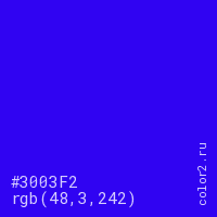Цвет #3003F2 в цветовой модели RGB обозначается тремя октетами (48, 3, 242) в десятичном формате и #3003F2 в шестнадцатиричном (hex) формате, которые являются интенсивностью красного 48 (hex 30), интенсивность зелёного 3 (hex 03) и интенсивность синего 242 (hex F2).