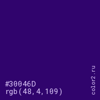 Цвет #30046D в цветовой модели RGB обозначается тремя октетами (48, 4, 109) в десятичном формате и #30046D в шестнадцатиричном (hex) формате, которые являются интенсивностью красного 48 (hex 30), интенсивность зелёного 4 (hex 04) и интенсивность синего 109 (hex 6D).
