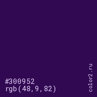 Цвет #300952 в цветовой модели RGB обозначается тремя октетами (48, 9, 82) в десятичном формате и #300952 в шестнадцатиричном (hex) формате, которые являются интенсивностью красного 48 (hex 30), интенсивность зелёного 9 (hex 09) и интенсивность синего 82 (hex 52).