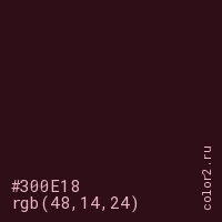 Цвет #300E18 в цветовой модели RGB обозначается тремя октетами (48, 14, 24) в десятичном формате и #300E18 в шестнадцатиричном (hex) формате, которые являются интенсивностью красного 48 (hex 30), интенсивность зелёного 14 (hex 0E) и интенсивность синего 24 (hex 18).