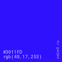 Цвет #3011FD в цветовой модели RGB обозначается тремя октетами (48, 17, 253) в десятичном формате и #3011FD в шестнадцатиричном (hex) формате, которые являются интенсивностью красного 48 (hex 30), интенсивность зелёного 17 (hex 11) и интенсивность синего 253 (hex FD).