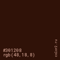 Цвет #301208 в цветовой модели RGB обозначается тремя октетами (48, 18, 8) в десятичном формате и #301208 в шестнадцатиричном (hex) формате, которые являются интенсивностью красного 48 (hex 30), интенсивность зелёного 18 (hex 12) и интенсивность синего 8 (hex 08).