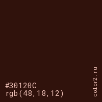 Цвет #30120C в цветовой модели RGB обозначается тремя октетами (48, 18, 12) в десятичном формате и #30120C в шестнадцатиричном (hex) формате, которые являются интенсивностью красного 48 (hex 30), интенсивность зелёного 18 (hex 12) и интенсивность синего 12 (hex 0C).