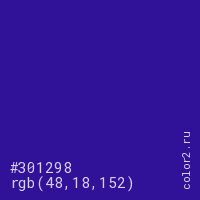 Цвет #301298 в цветовой модели RGB обозначается тремя октетами (48, 18, 152) в десятичном формате и #301298 в шестнадцатиричном (hex) формате, которые являются интенсивностью красного 48 (hex 30), интенсивность зелёного 18 (hex 12) и интенсивность синего 152 (hex 98).