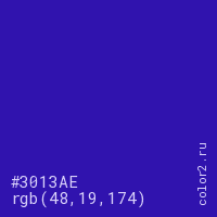 Цвет #3013AE в цветовой модели RGB обозначается тремя октетами (48, 19, 174) в десятичном формате и #3013AE в шестнадцатиричном (hex) формате, которые являются интенсивностью красного 48 (hex 30), интенсивность зелёного 19 (hex 13) и интенсивность синего 174 (hex AE).