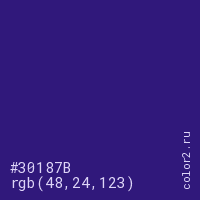 Цвет #30187B в цветовой модели RGB обозначается тремя октетами (48, 24, 123) в десятичном формате и #30187B в шестнадцатиричном (hex) формате, которые являются интенсивностью красного 48 (hex 30), интенсивность зелёного 24 (hex 18) и интенсивность синего 123 (hex 7B).