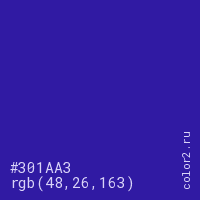 Цвет #301AA3 в цветовой модели RGB обозначается тремя октетами (48, 26, 163) в десятичном формате и #301AA3 в шестнадцатиричном (hex) формате, которые являются интенсивностью красного 48 (hex 30), интенсивность зелёного 26 (hex 1A) и интенсивность синего 163 (hex A3).