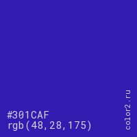 Цвет #301CAF в цветовой модели RGB обозначается тремя октетами (48, 28, 175) в десятичном формате и #301CAF в шестнадцатиричном (hex) формате, которые являются интенсивностью красного 48 (hex 30), интенсивность зелёного 28 (hex 1C) и интенсивность синего 175 (hex AF).