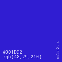 Цвет #301DD2 в цветовой модели RGB обозначается тремя октетами (48, 29, 210) в десятичном формате и #301DD2 в шестнадцатиричном (hex) формате, которые являются интенсивностью красного 48 (hex 30), интенсивность зелёного 29 (hex 1D) и интенсивность синего 210 (hex D2).