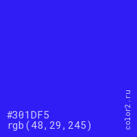 Цвет #301DF5 в цветовой модели RGB обозначается тремя октетами (48, 29, 245) в десятичном формате и #301DF5 в шестнадцатиричном (hex) формате, которые являются интенсивностью красного 48 (hex 30), интенсивность зелёного 29 (hex 1D) и интенсивность синего 245 (hex F5).