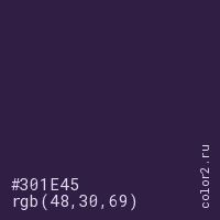 Цвет #301E45 в цветовой модели RGB обозначается тремя октетами (48, 30, 69) в десятичном формате и #301E45 в шестнадцатиричном (hex) формате, которые являются интенсивностью красного 48 (hex 30), интенсивность зелёного 30 (hex 1E) и интенсивность синего 69 (hex 45).