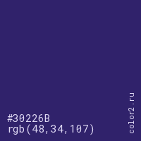 Цвет #30226B в цветовой модели RGB обозначается тремя октетами (48, 34, 107) в десятичном формате и #30226B в шестнадцатиричном (hex) формате, которые являются интенсивностью красного 48 (hex 30), интенсивность зелёного 34 (hex 22) и интенсивность синего 107 (hex 6B).