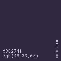 Цвет #302741 в цветовой модели RGB обозначается тремя октетами (48, 39, 65) в десятичном формате и #302741 в шестнадцатиричном (hex) формате, которые являются интенсивностью красного 48 (hex 30), интенсивность зелёного 39 (hex 27) и интенсивность синего 65 (hex 41).