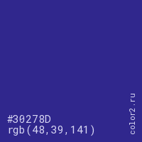 Цвет #30278D в цветовой модели RGB обозначается тремя октетами (48, 39, 141) в десятичном формате и #30278D в шестнадцатиричном (hex) формате, которые являются интенсивностью красного 48 (hex 30), интенсивность зелёного 39 (hex 27) и интенсивность синего 141 (hex 8D).