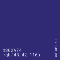 Цвет #302A74 в цветовой модели RGB обозначается тремя октетами (48, 42, 116) в десятичном формате и #302A74 в шестнадцатиричном (hex) формате, которые являются интенсивностью красного 48 (hex 30), интенсивность зелёного 42 (hex 2A) и интенсивность синего 116 (hex 74).