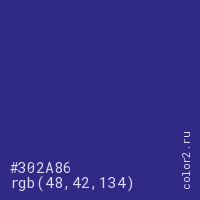Цвет #302A86 в цветовой модели RGB обозначается тремя октетами (48, 42, 134) в десятичном формате и #302A86 в шестнадцатиричном (hex) формате, которые являются интенсивностью красного 48 (hex 30), интенсивность зелёного 42 (hex 2A) и интенсивность синего 134 (hex 86).
