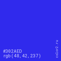 Цвет #302AED в цветовой модели RGB обозначается тремя октетами (48, 42, 237) в десятичном формате и #302AED в шестнадцатиричном (hex) формате, которые являются интенсивностью красного 48 (hex 30), интенсивность зелёного 42 (hex 2A) и интенсивность синего 237 (hex ED).