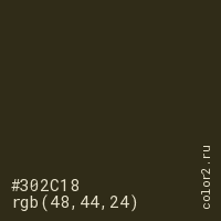 Цвет #302C18 в цветовой модели RGB обозначается тремя октетами (48, 44, 24) в десятичном формате и #302C18 в шестнадцатиричном (hex) формате, которые являются интенсивностью красного 48 (hex 30), интенсивность зелёного 44 (hex 2C) и интенсивность синего 24 (hex 18).