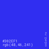 Цвет #302EF1 в цветовой модели RGB обозначается тремя октетами (48, 46, 241) в десятичном формате и #302EF1 в шестнадцатиричном (hex) формате, которые являются интенсивностью красного 48 (hex 30), интенсивность зелёного 46 (hex 2E) и интенсивность синего 241 (hex F1).