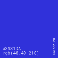Цвет #3031DA в цветовой модели RGB обозначается тремя октетами (48, 49, 218) в десятичном формате и #3031DA в шестнадцатиричном (hex) формате, которые являются интенсивностью красного 48 (hex 30), интенсивность зелёного 49 (hex 31) и интенсивность синего 218 (hex DA).