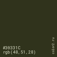 Цвет #30331C в цветовой модели RGB обозначается тремя октетами (48, 51, 28) в десятичном формате и #30331C в шестнадцатиричном (hex) формате, которые являются интенсивностью красного 48 (hex 30), интенсивность зелёного 51 (hex 33) и интенсивность синего 28 (hex 1C).