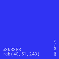 Цвет #3033F3 в цветовой модели RGB обозначается тремя октетами (48, 51, 243) в десятичном формате и #3033F3 в шестнадцатиричном (hex) формате, которые являются интенсивностью красного 48 (hex 30), интенсивность зелёного 51 (hex 33) и интенсивность синего 243 (hex F3).