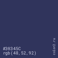 Цвет #30345C в цветовой модели RGB обозначается тремя октетами (48, 52, 92) в десятичном формате и #30345C в шестнадцатиричном (hex) формате, которые являются интенсивностью красного 48 (hex 30), интенсивность зелёного 52 (hex 34) и интенсивность синего 92 (hex 5C).