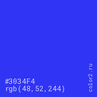 Цвет #3034F4 в цветовой модели RGB обозначается тремя октетами (48, 52, 244) в десятичном формате и #3034F4 в шестнадцатиричном (hex) формате, которые являются интенсивностью красного 48 (hex 30), интенсивность зелёного 52 (hex 34) и интенсивность синего 244 (hex F4).