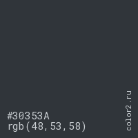 Цвет #30353A в цветовой модели RGB обозначается тремя октетами (48, 53, 58) в десятичном формате и #30353A в шестнадцатиричном (hex) формате, которые являются интенсивностью красного 48 (hex 30), интенсивность зелёного 53 (hex 35) и интенсивность синего 58 (hex 3A).