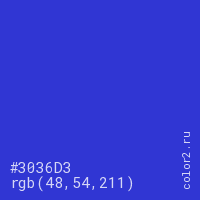 Цвет #3036D3 в цветовой модели RGB обозначается тремя октетами (48, 54, 211) в десятичном формате и #3036D3 в шестнадцатиричном (hex) формате, которые являются интенсивностью красного 48 (hex 30), интенсивность зелёного 54 (hex 36) и интенсивность синего 211 (hex D3).
