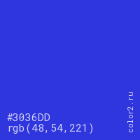 Цвет #3036DD в цветовой модели RGB обозначается тремя октетами (48, 54, 221) в десятичном формате и #3036DD в шестнадцатиричном (hex) формате, которые являются интенсивностью красного 48 (hex 30), интенсивность зелёного 54 (hex 36) и интенсивность синего 221 (hex DD).