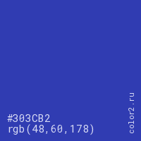 Цвет #303CB2 в цветовой модели RGB обозначается тремя октетами (48, 60, 178) в десятичном формате и #303CB2 в шестнадцатиричном (hex) формате, которые являются интенсивностью красного 48 (hex 30), интенсивность зелёного 60 (hex 3C) и интенсивность синего 178 (hex B2).