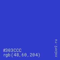 Цвет #303CCC в цветовой модели RGB обозначается тремя октетами (48, 60, 204) в десятичном формате и #303CCC в шестнадцатиричном (hex) формате, которые являются интенсивностью красного 48 (hex 30), интенсивность зелёного 60 (hex 3C) и интенсивность синего 204 (hex CC).